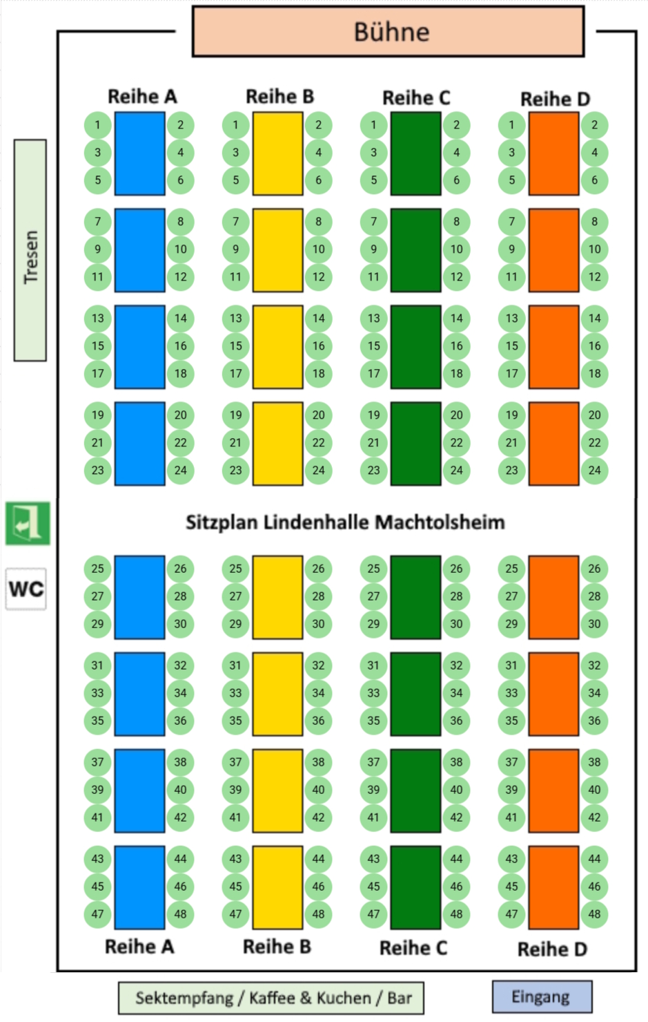 ! Im Vorverkauf nicht reservierte Plätze bzw. reservierte Platzkarten, die am Veranstaltungsabend bis 19:00 Uhr nicht an der Abendkasse abgeholt werden, werden dann im freien Verkauf angeboten. ! Im unteren Bild sind die Platznummern aufgeführt, welche bei der Reservierung vergeben werden. |